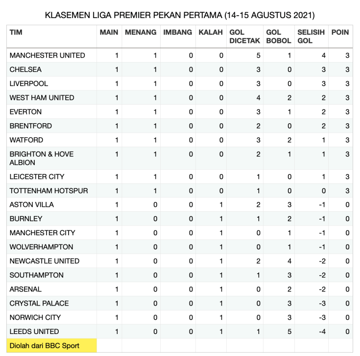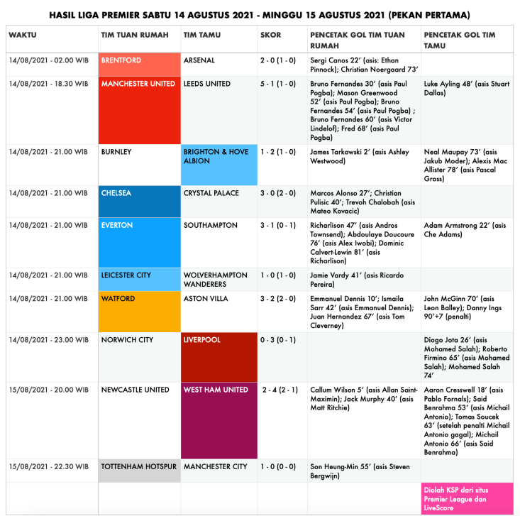 Catatan: Artikel ini diperbarui hari Senin (16/8/2021) dinihari WIB (dengan pembaruan hasil pertandingan terakhir Spurs vs City)