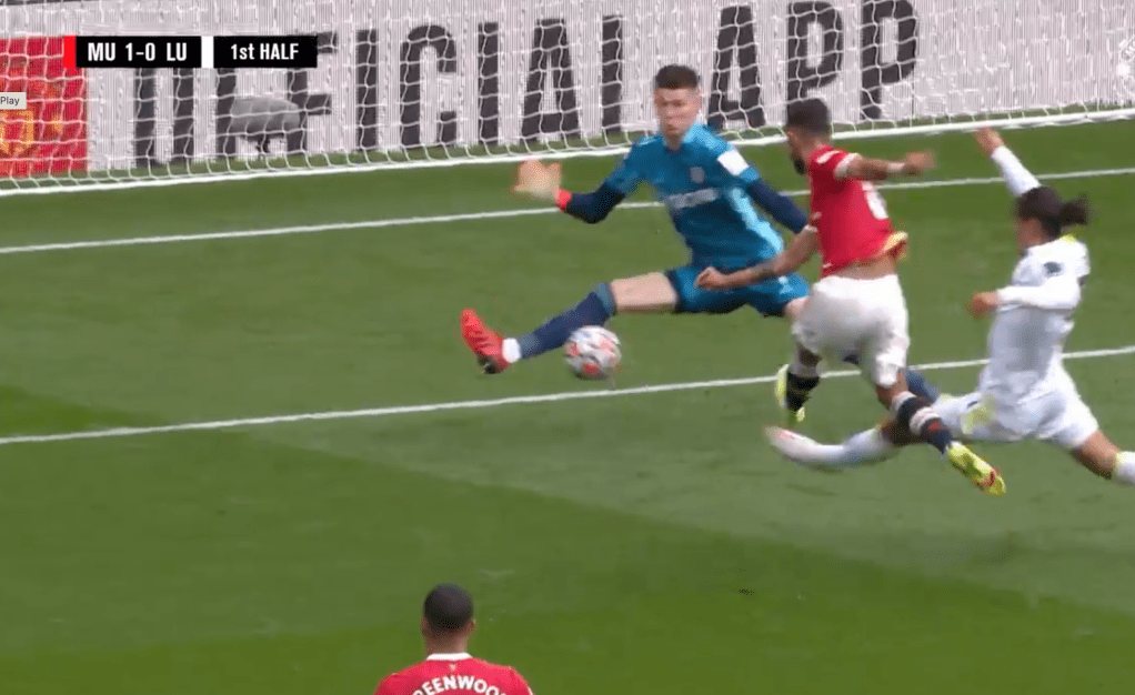 Setelah Bruno mencetak gol pertama ke gawang Leeds yang membawa MU unggul 1-0 sebelum turun minum, pemain Leeds Luke Ayling memanfaatkan asis Stuart Dallas menendang bola langsung ke gawang MU yang dijaga David de Gea dan menyamakan skor 1-1, tiga menit setelah babak kedua dimulai.