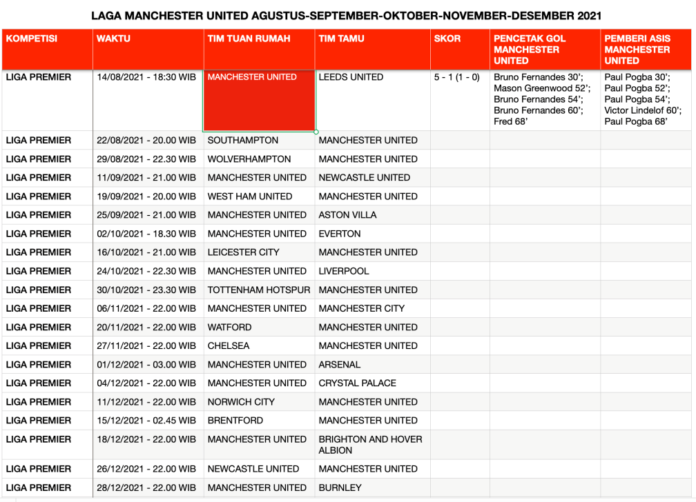 MANCHESTER UNITED: De Gea, Wan-Bissaka, Lindelof, Maguire (C), Shaw, Fred, McTominay (Matic 68), James (Sancho 76), Fernandes, Pogba (Martial 74), Greenwood. Pemain pengganti tidak diturunkan: Heaton, Dalot, Williams, Andreas, Mata, van de Beek. Gol: Fernandes (30, 53, 60), Greenwood (51), Fred (68). Kartu kuning: Shaw