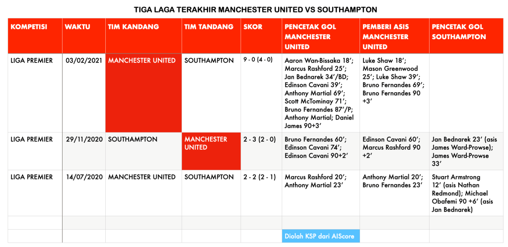 Pada musim 2020/2021 lalu, Manchester United menggilas Southampton di Old Trafford dengan skor fantastis: 9-0. Skor ini menyamai rekor yang pernah diciptakan MU pada 1995 saat berhadapan dengan Ipswich.