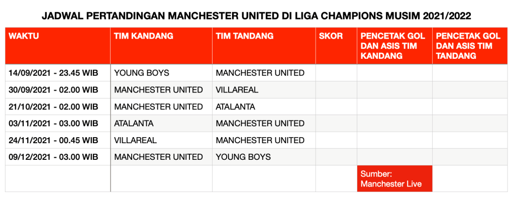 Manchester United akan menghadapi Villareal, Atalanta, dan Young Boys dalam babak penyisihan Liga Champions musim 2021/2022. Turnamen sepakbola Eropa bergengsi ini akan mulai bergulir 14 September 2021 mendatang.