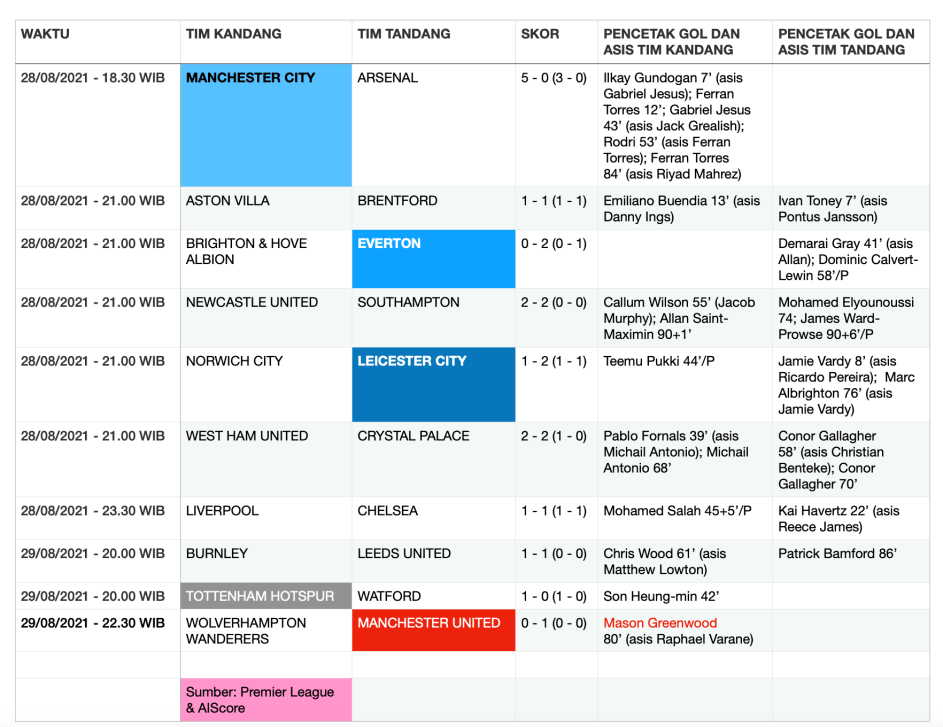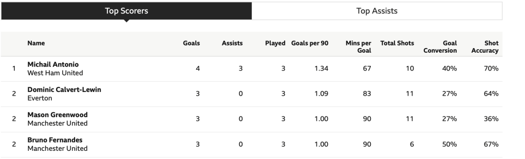 Sampai pekan ketiga, Mason Greenwood kini mengoleksi tiga gol, jumlah yang sama dicetak rekan satu klubnya, Bruno Fernandes, dan Dominic Calvert-Lewin (Everton). Adapun pencetak gol terbanyak Michail Antonio (West Ham United) yang sampai pekan ketiga Liga Premier mengoleksi 4 gol.