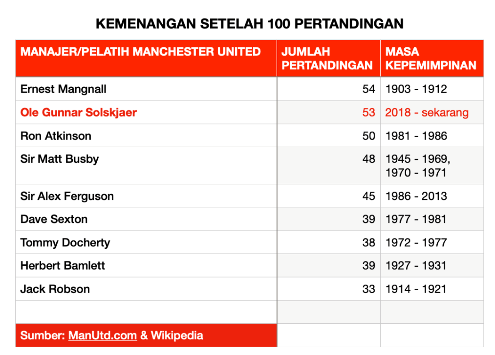 Pelatih asal Norwegia ini merupakan orang kesembilan yang dalam satu abad mencapai rekor ini di Old Trafford. Hanya satu orang yang memiliki rekor lebih baik dari Solskjaer, yaitu Ernest Mangnall, yang menjadi bos The Red Devils antara 1903 dan 1912, merebut dua gelar liga pertama MU, dan Piala FA perdana, memenangkan 54 dari 100 pertandingan pertamanya.