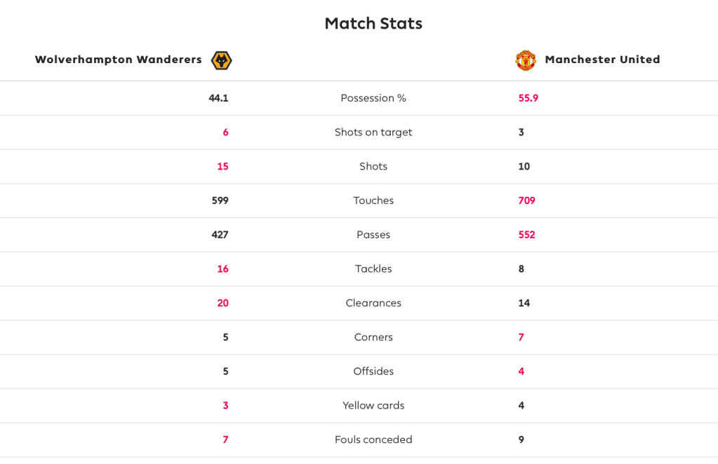 David de Gea mematahkan dua serangan Romain Saïss yang menyambut tendangan pojok. Dua penyelamatan gemilang oleh kiper de Gea sebelum akhirnya bola dihalau oleh Aaron Wan-Bissaka.