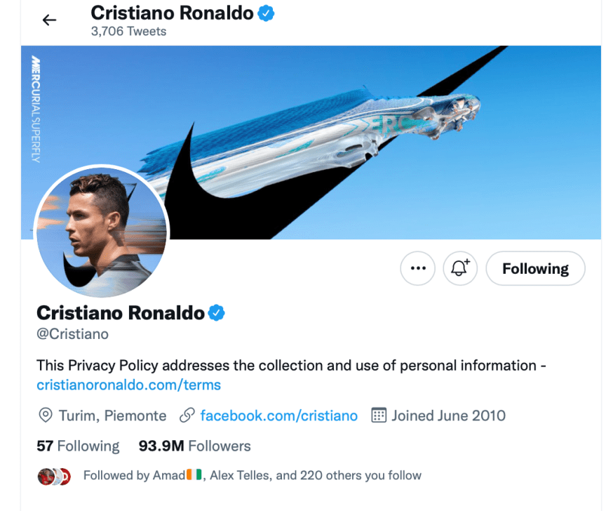 Pesepakbola berusia 36 tahun ini adalah olahragawan paling populer di Twitter dengan 93,9 juta pengikut. Hanya Barack Obama (mantan Presiden Amerika Serikat) ditambah bintang pop Justin Bieber, Katy Perry, dan Rihanna yang dapat mengalahkannya.