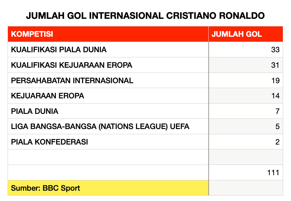 Cristiano Ronaldo berada di peringkat atas dengan 111 gol dan Ali Daei di peringkat kedua dengan 109 gol, data ini tidak diragukan lagi. Daei Ali yang bermain untuk Bayern Muenchen telah memecahkan rekor legenda Hungaria, Ferenc Puskas, yang pada tahun 2003 telah mencetak gol ke-85. Tahun 2003 tahun Cristiano melakukan debut internasionalnya.