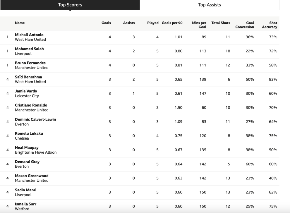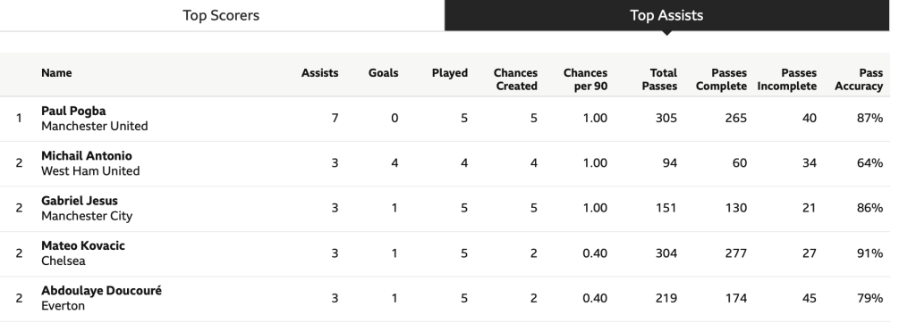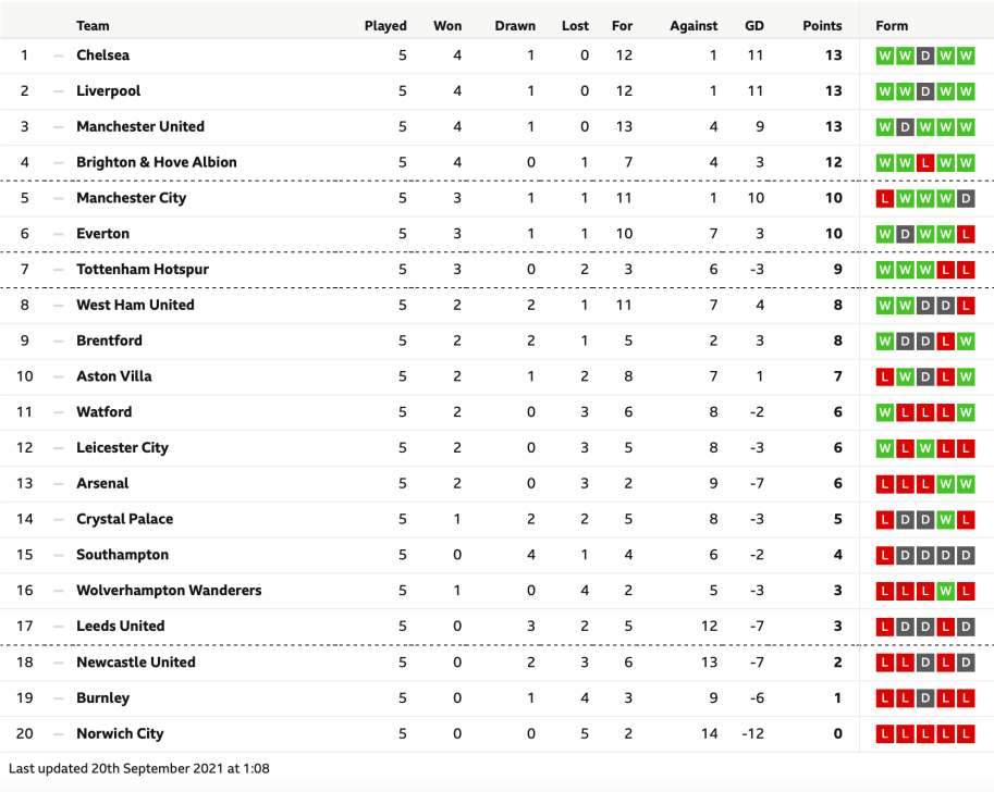 Manchester United bersama Chelsea dan Liverpool sama-sama mengoleksi 13 poin, namun posisi ManUnited di puncak klasemen diambil alih Chelsea dan Liverpool karena kedua klub itu unggul dalam jumlah gol (memasukkan 12 gol, kemasukan 1 gol). Pada pekan kelima, Chelsea unggul 3-0 atas Tottenham Hotspur, dan Liverpool menang 3-0 atas Crystal Palace. Adapun Manchester United memasukkan 13 gol, kemasukan 4 gol.