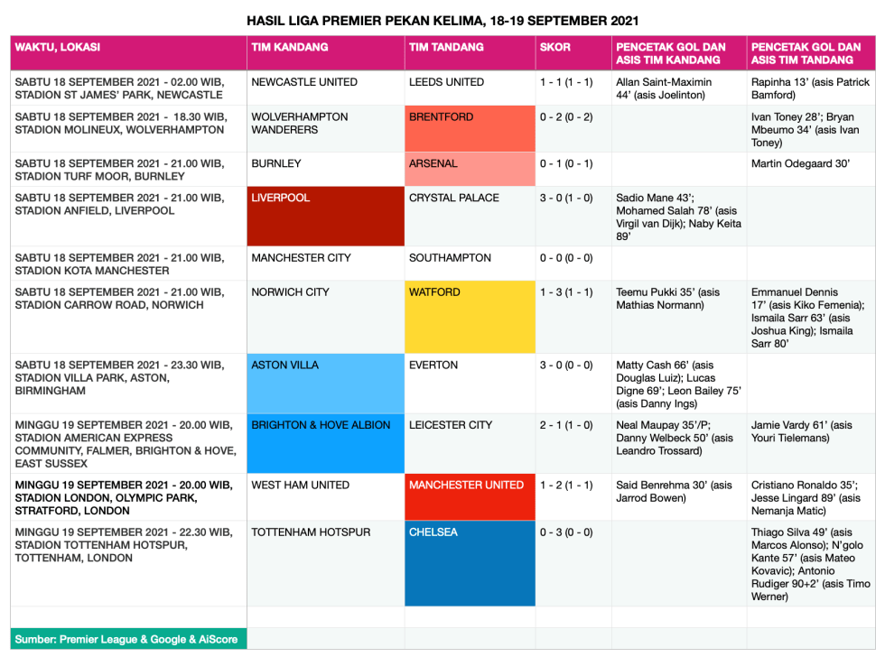 MANCHESTER UNITED: De Gea; Wan-Bissaka, Varane, Maguire (c), Shaw; McTominay, Fred (Matic 88); Greenwood (Lingard 72), Fernandes, Pogba (Sancho 72); Ronaldo. Pemain pengganti tidak diturunkan: Heaton, Bailly, Dalot, Mata, van de Beek, Martial. Gol: Ronaldo 35, Lingard 89.