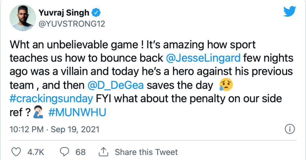 Mantan pemain cricket India, Yuvraj Singh, seperti halnya Tyson Fury, terinspirasi dengan kemampuan Jesse pulih dari kemunduran. Yuvraj Singh @Yuvstrong12 ngetwit kepada 5,4 juta pengikutnya, “Sungguh pertandingan yang sulit dipercaya! Sungguh ajaib bagaimana olahraga mengajarkan kepada kita bagaimana Jesse Lingard bangkit kembali setelah beberapa malam sebelumnya menjadi pecundang dan hari ini menjadi pahlawan, dan David De Gea menyelamatkan MU hari ini. Lalu bagaimana dengan penalti untuk MU, hai wasit?”