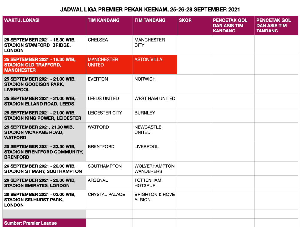 Sampai pekan kelima, Manchester United mengoleksi 13 poin, sama dengan Chelsea dan Liverpool, hasil empat kali menang dan satu kali imbang. The Red Devils hanya kalah dari selisih gol. Chelsea pada pekan ini akan menghadapi Manchester City, sedangkan Liverpool ke kandang Brentford.