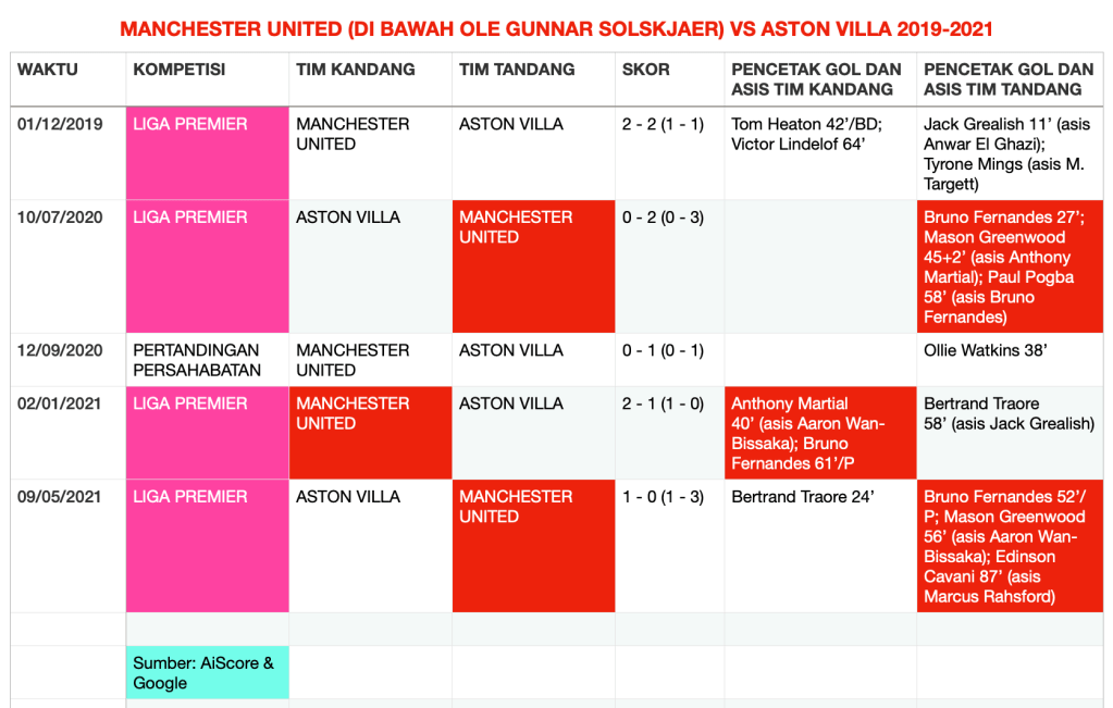 Bruno Fernandes dan Mason Greenwood yang pada laga Piala Carabao vs West Ham sebagai pemain pengganti, kemungkinan besar akan tampil sebagai starter dalam laga vs Aston Villa. Kedua pemain ini mencetak gol dalam pertandingan tandang MU vs Villa bulan Mei lalu.