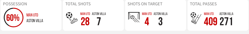 Dua puluh delapan tembakan MU itu, dua di antaranya nyaris membobol gawang Villa. Sundulan Harry Maguire ditepis kiper Martinez, dan sundulan Paul Pogba tipis di luar gawang Villa. Para pemain MU menciptakan 21 peluang dan menembak empat kali dalam target.