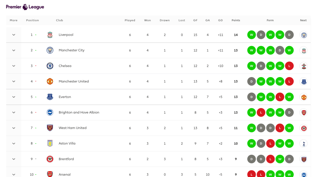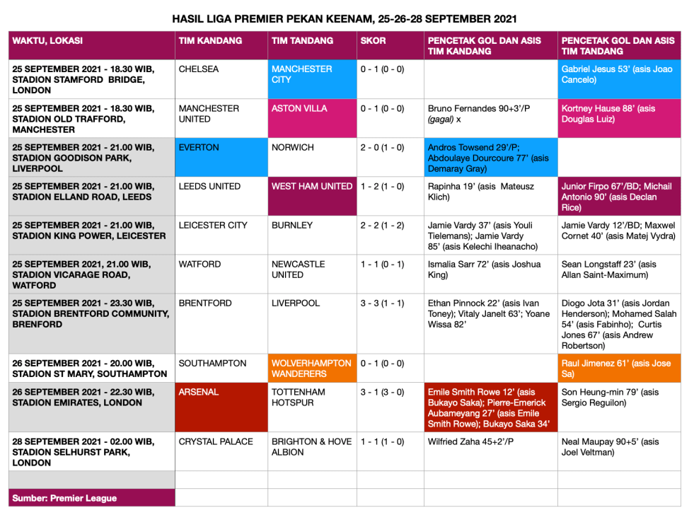 Kekalahan ini menyebabkan posisi Manchester United melorot ke posisi ke-4 klasemen pekan keenam Liga Premier. Liverpool kini di puncak klasemen dengan 14 poin setelah “dipaksa” bermain imbang 3-3 di kandang Brentford. Sementara Chelsea yang juga kalah 0-1 dari Manchester City sama-sama mengoleksi 13 poin tapi unggul dalam selisih gol (memasukkan 12 gol, kebobolan 2) dari MU (memasukkan 13 gol, kemasukan 5 gol). Adapun City yang juga mengoleksi 13 poin berada di posisi ke-2 dengan selisih gol lebih baik (memasukkan 12 gol, kebobolan 1 gol).