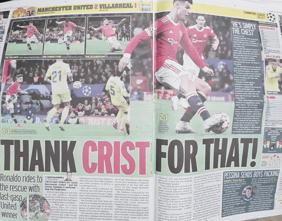 Ronaldo mengatakan semalam, “itulah sebabnya saya kembali” dan halaman belakang The Times sepakat dengan kalimat tersebut. “Cristiano Ronaldo sekali lagi menunjukkan kapasitasnya untuk menghasilkan drama yang hebat ketika dia mencetak gol Manchester United atas Villareal — kemenangan yang hampir tidak pantas mereka dapatkan,” tulis The Times.