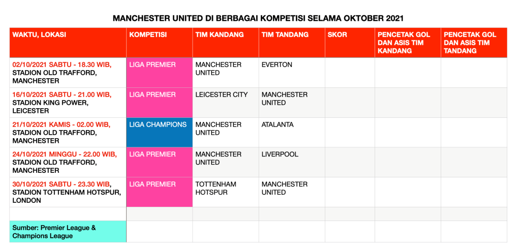 Selama bulan Oktober 2021, Manchester United akan menjalani lima pertandingan, empat di antaranya di Liga Premier, dan satu lainnya di Liga Champions. Dua klub Liverpool akan menjadi lawan ManUnited bulan ini yaitu Everton dan Liverpool — rival klasik MU. Adapun dalam lanjutan babak penyisihan grup di Liga Champions, The Red Devils akan menjamu klub Italia, Atalanta di Old Trafford.