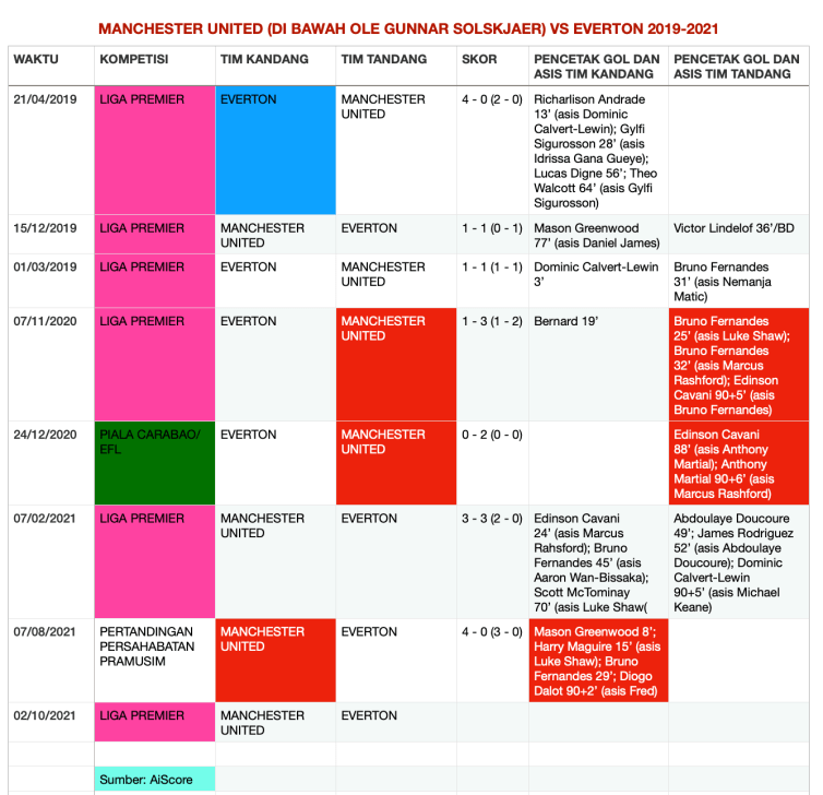Dalam pertandingan persahabatan pramusim 7 Agustus lalu, Manchester United menggilas Everton 4-0. Di Liga Premier Februari 2021 musim lalu, MU bermain imbang 3-3 di Old Trafford dan pada 7 November 2020, MU menang 3-1 di Goodison Park. Di Piala Carabao musim lalu yang dimainkan menjelang Natal 2020, MU menang 2-0 atas Everton.