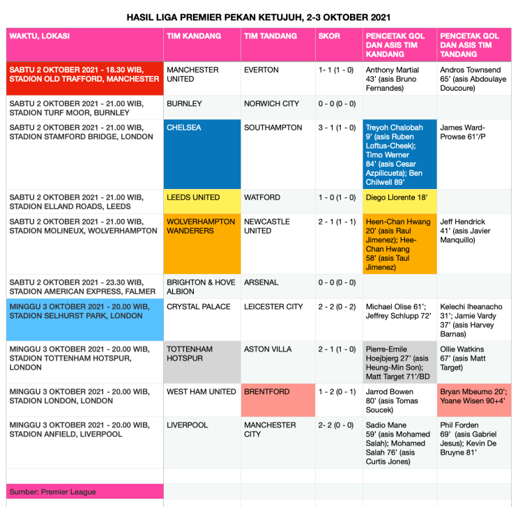 CATATAN: Tulisan ini diperbarui Senin (4/10/2021) dinihari WIB, dengan pembaruan data pertandingan terakhir pekan ketujuh Liverpool vs Manchester City.