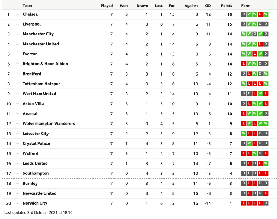 Sampai pekan ketujuh, Senin (4/10/2021) dinihari WIB, Manchester United berada di posisi ke-4 klasemen Liga Premier, mengoleksi 14 poin, sama dengan Manchester City – yang berada di posisi ke-3 karena unggul dalam selisih gol. Liverpool dan Manchester City berbagi angka 2-2 dalam pertandingan pamungkas pekan ketujuh.