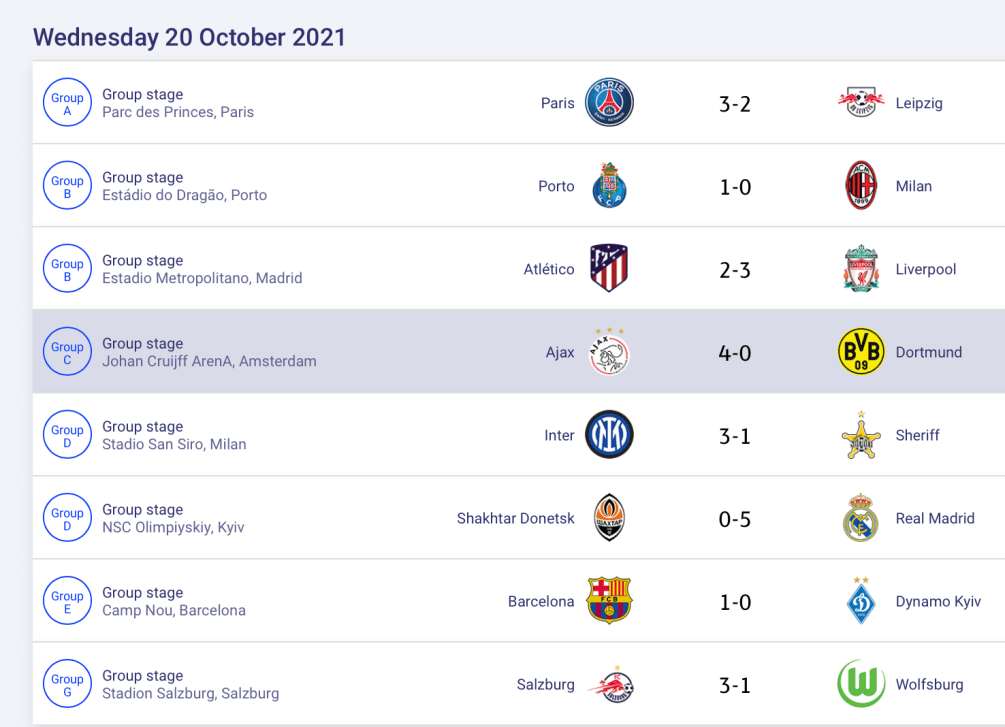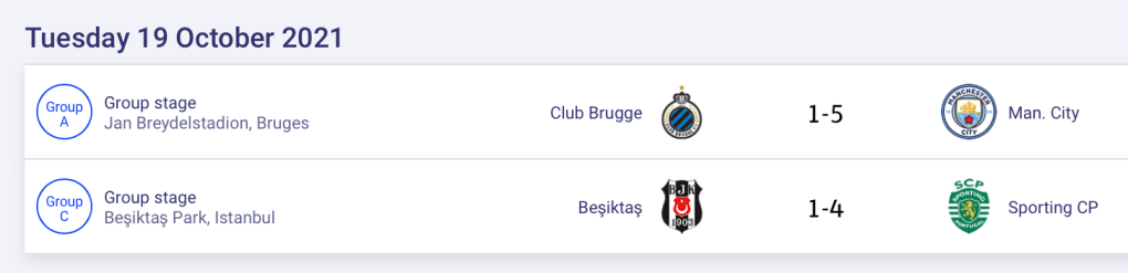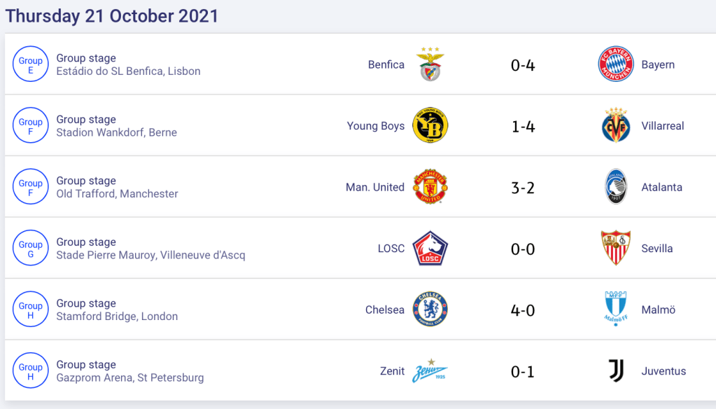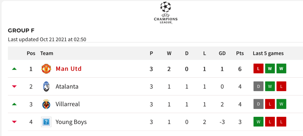 Manchester United membalikkan keadaan dari posisi tertinggal 0-2 di babak pertama, menjadi kemenangan 3-2 atas Atalanta di Old Trafford, Kamis (21/10/2021) dinihari WIB. Cristiano Ronaldo mencetak gol penentu kemenangan pada menit ke-81 setelah sebelumnya Marcus Rashford dan Harry Maguire menyamakan skor 2-2. Tiga poin penting ini membawa Manchester United pemuncak klasemen Grup F dengan 6 poin. Dalam pertandingan lain di grup yang sama, Villareal menang 4-1 atas Young Boys.