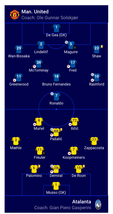 Klub Italia, Atalanta, sempat mengejutkan puluhan ribu pendukung MU di Old Trafford ketika unggul lebih dulu 2-0 pada babak pertama melalui gol-gol Mario Pasalic pada menit ke-15 dan Merit Demiral pada menit ke-29. Ini merupakan babak pertama yang buruk bagi MU yang mengincar tiga poin kemenangan. Namun MU mampu bangkit dari keterpurukan dan mencetak tiga gol di babak kedua dalam pertandingan yang menegangkan dan brilian.