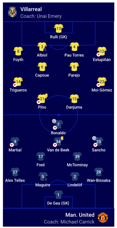MANCHESTER UNITED: De Gea; Wan-Bissaka, Lindelof, Maguire (c), Telles; Fred, McTominay; Sancho (Mata 93), van de Beek (Fernandes 66), Martial (Rashford 66); Ronaldo (Matic 91). PEMAIN CADANGAN TIDAK DITURUNKAN: Heaton, Henderson, Bailly, Dalot, Lingard, Amad. GOL: Ronaldo 78, Sancho 90. KARTU KUNING: Van de Beek.