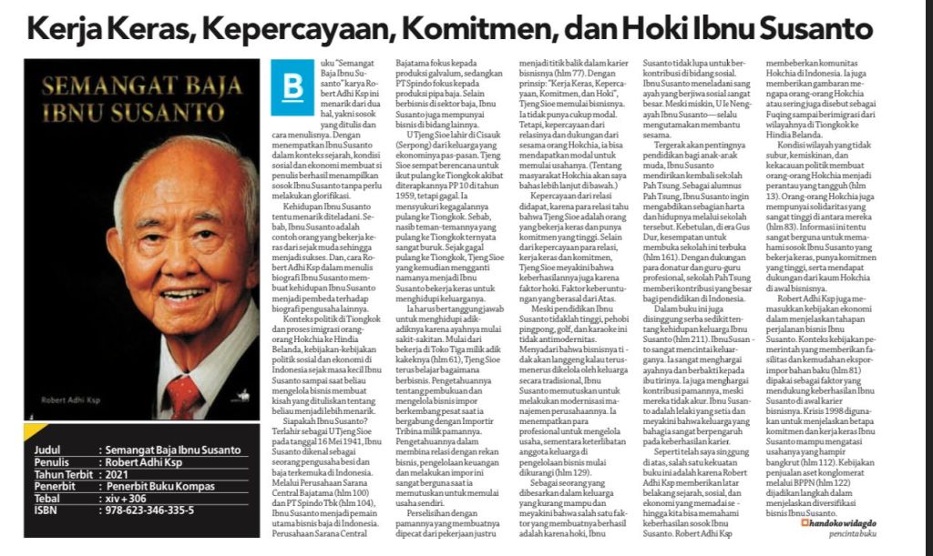 Buku “Semangat Baja Ibnu Susanto” karya Robert Adhi Ksp ini menarik dari dua hal, yakni sosok yang ditulis, dan cara menulisnya. Dengan menempatkan Ibnu Susanto dalam konteks sejarah, dan memberi latar belakang kondisi sosial dan ekonomi, si penulis berhasil menampilkan sosok Ibnu Susanto tanpa perlu melakukan glorifikasi. Cara Robert Adhi Ksp menulis biografi ini membuat kehidupan Ibnu Susanto menjadi pembeda dengan biografi pengusaha lainnya.