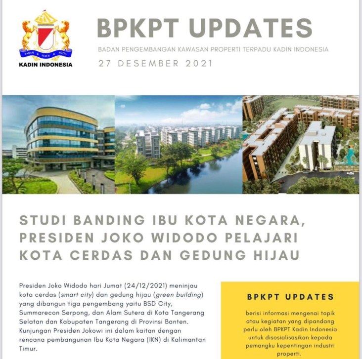 Presiden Joko Widodo hari Jumat (24/12/2021) meninjau kota cerdas (smart city) dan gedung hijau (green building) yang dibangun tiga pengembang yaitu BSD City, Summarecon Serpong, dan Alam Sutera di Kota Tangerang Selatan dan Kabupaten Tangerang di Provinsi Banten. Kunjungan Presiden Jokowi ini dalam kaitan dengan rencana pembangunan Ibu Kota Negara (IKN) di Kalimantan Timur.