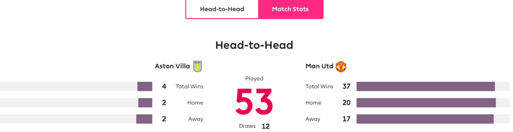 Dari 53 kali pertemuan MU vs Aston Villa di Liga Premier, The Red Devils mencatat 37 kali menang, 12 kali bermain imbang, dan 4 kali kalah.