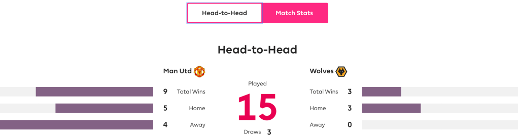 Dari 15 kali pertemuan dengan Wolves di Liga Premier, MU 9 kali menang dan 3 kali bermain imbang dan 3 kali kalah.
