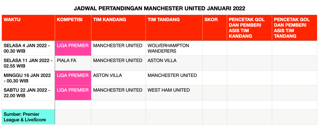 Selama Januari 2022, Manchester United akan menjalani empat pertandingan, tiga di antaranya Liga Premier dan satu lagi pertandingan Piala FA. Sampai akhir Desember 2021, Manchester United sudah menjalani 18 pertandingan, mengoleksi 31 poin, hasil dari 9 kali menang, 4 kali imbang, 5 kali kalah, dan berada di posisi ke-6. Namun pada awal Januari 2022, posisi MU bergeser ke urutan 7 setelah Spurs menang 1-0 atas Watford dan West Ham menang 3-2 atas Crystal Palace. Jarak MU dengan pemuncak klasemen, Manchester City cukup jauh, 22 poin. ManCity sudah 21 kali bermain, hasil 17 kali menang — termasuk unggul 2-1 atas Arsenal awal 2022 ini.