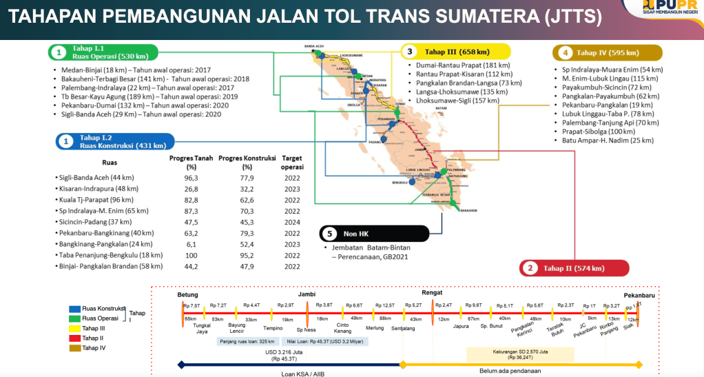 JTTS yang beroperasi sejak 2017 dan sampai akhir Maret 2022 panjang jalan yang sudah beroperasi adalah 530 kilometer dari 2.788 kilometer yang direncanakan. Ruas tol yang sudah beroperasi itu adalah Medan-Binjai 18 km (beroperasi 2017), Bakauheni-Terbagi Besar 141 km (2018), Palembang-Indralaya 22 km (2017), Terbagi Besar-Kayu Agung 189 km (2019), Pekanbaru-Dumai 132 km (2020), dan Sigli-Banda Aceh 29 km (2020).