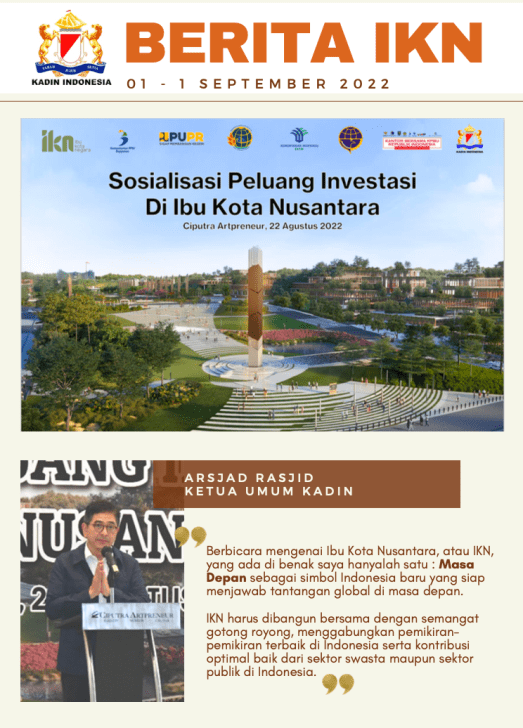 “Berbicara mengenai Ibu Kota Nusantara, atau IKN, yang ada di benak saya hanyalah satu : Masa Depan sebagai simbol Indonesia baru yang siap menjawab tantangan global di masa depan. IKN harus dibangun bersama dengan semangat gotong royong, menggabungkan pemikiran- pemikiran terbaik di Indonesia serta kontribusi optimal baik dari sektor swasta maupun sektor publik di Indonesia,” kata Ketua Umum Kadin Arsjad Rasjid.