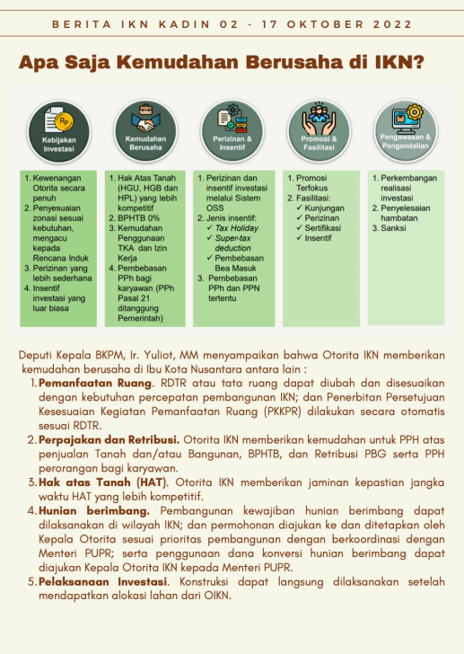 Deputi Kepala BKPM, Ir. Yuliot, MM menyampaikan bahwa Otorita IKN memberikan kemudahan berusaha di Ibu Kota Nusantara antara lain :
