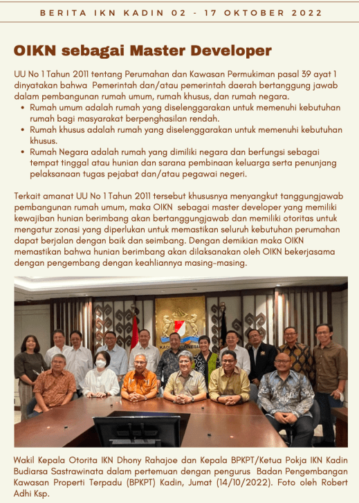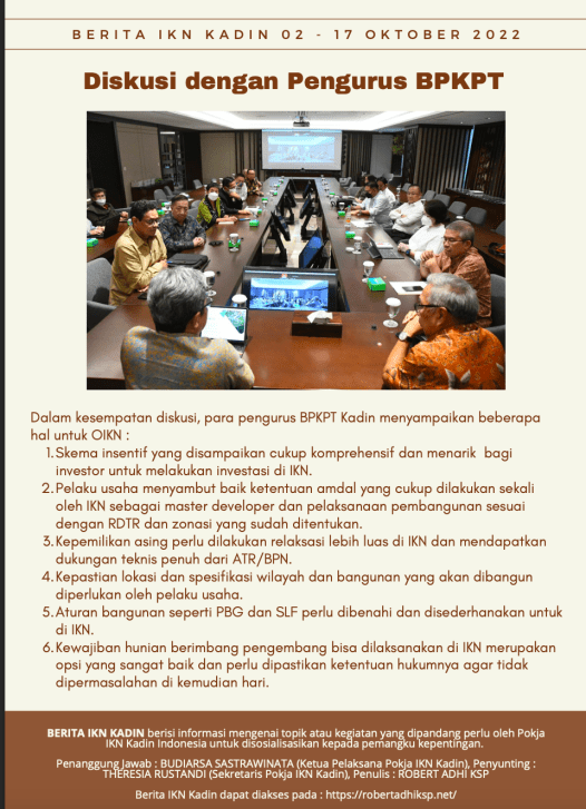 Wakil Kepala Otorita IKN Dhony Rahajoe mengungkapkan hal ini dalam pertemuannya dengan jajaran pengurus Badan Pengembangan Kawasan Properti Terpadu (BPKPT) Kadin Indonesia, Jumat (14/10/2022). Hadir Kepala BPKPT Kadin Budiarsa Sastrawinata, yang juga Ketua Pokja IKN Kadin Indonesia serta Deputi Kepala BKPM Bidang Pengembangan Iklim Penanaman Modal Ir. Yuliot, MM.