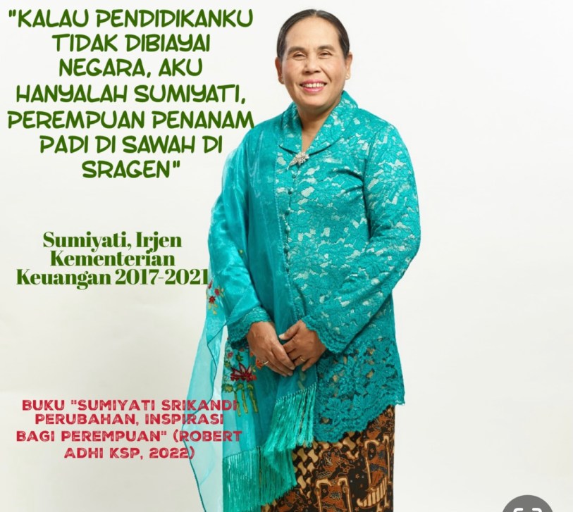 Buku “Sumiyati, Srikandi Perubahan, Inspirasi Bagi Perempuan” merupakan biografi profesional Sumiyati, perempuan pertama yang menjabat Inspektur Jenderal di Kementerian Keuangan. Sumiyati, anak desa dari Sragen, Jawa Tengah ini dalam pengabdiannya selama 39 tahun 4 bulan, meninggalkan banyak legacy yang bermanfaat bagi insan Kemenkeu, di antaranya mendirikan Corporate University (Corpu) — yang kini menjadi benchmark bagi kementerian dan lembaga lain di Indonesia, dan mengubah status STAN menjadi Politeknik Keuangan Negara STAN.