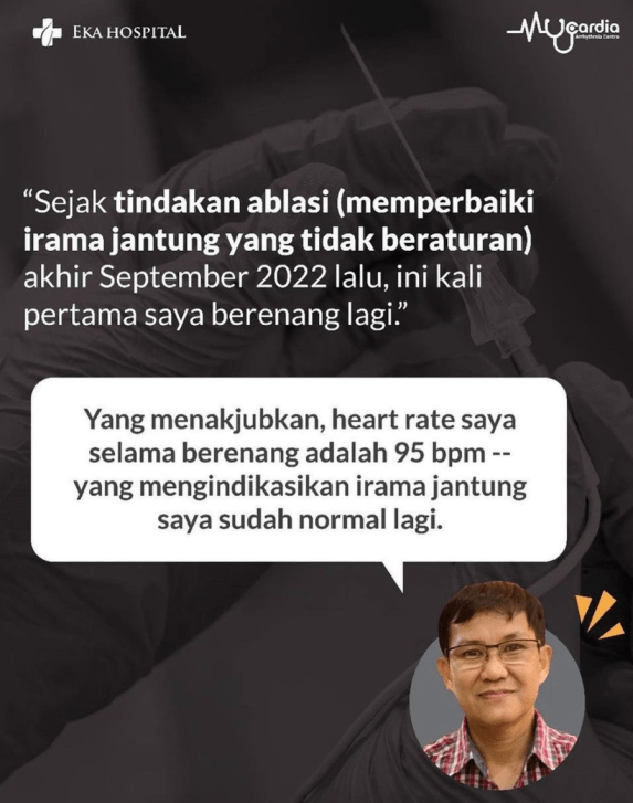 Kedua, aku ingin menyampaikan terima kasih kepada dokter Ign Yansen dari Eka Hospital atas saran dan tindakan ablasi ini. Sekarang aku tak perlu waswas tentang irama jantungku selama berolahraga. Dokter Ign Yansen adalah satu dari 40 dokter ahli jantung di Indonesia yang mendalami spesialisasi aritmia atas saran dan tindakan ablasi.