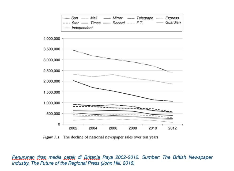 Di Britania Raya (United Kingdom), jumlah tiras media cetak terus menurun dalam kurun waktu 2002-2012, mulai dari The Sun, Daily Mail, The Mirror, The Telegraph, The Express, The Star, The Times, The Record, Financial Times, The Guardian, hingga Independent.