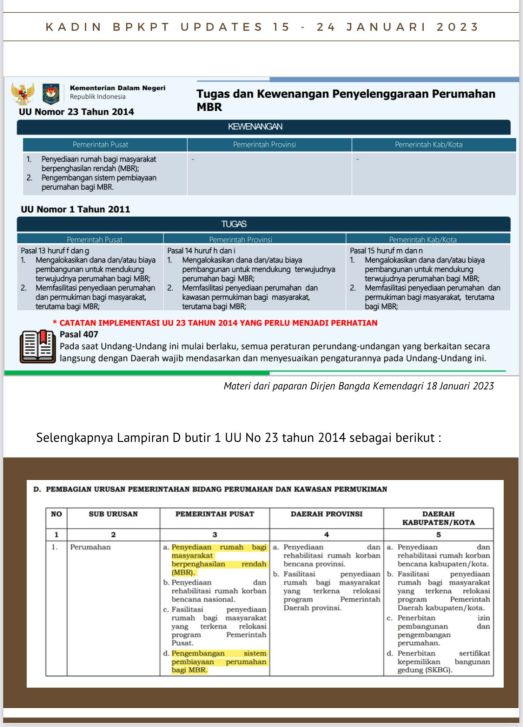 Dirjen Bangda Teguh Setyabudi dalam presentasinya menyampaikan adanya kontradiksi UU mengenai peran Pemda dalam menyediakan perumahan rakyat. Menurut UU No 23 tahun 2014 kewenangan penyelenggaraan perumahan MBR ada di pemerintah pusat, sementara UU No 1 tahun 2011 tugas penyelenggaraan perumahan MBR juga menjadi tugas pemerintah provinsi dan kabupaten/kota.