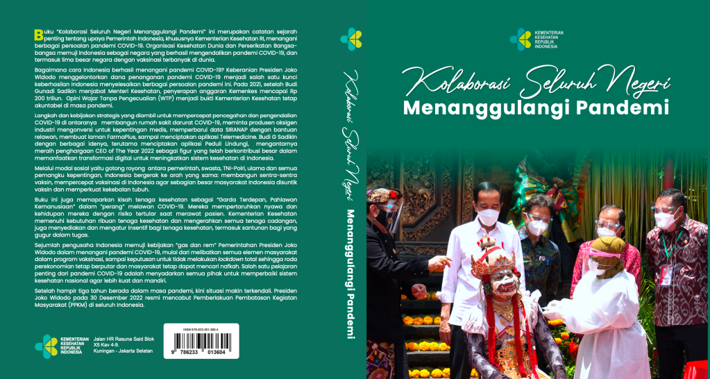 Buku “Kolaborasi Seluruh Negeri Menanggulangi Pandemi” yang diterbitkan Kementerian Kesehatan ini digagas oleh Sekretaris Jenderal Pak Kunta Wibawa Dasa Nugraha, ditulis berdasarkan hasil wawancara dengan puluhan narasumber dari lingkungan Kementerian Kesehatan maupun dari luar Kemenkes.