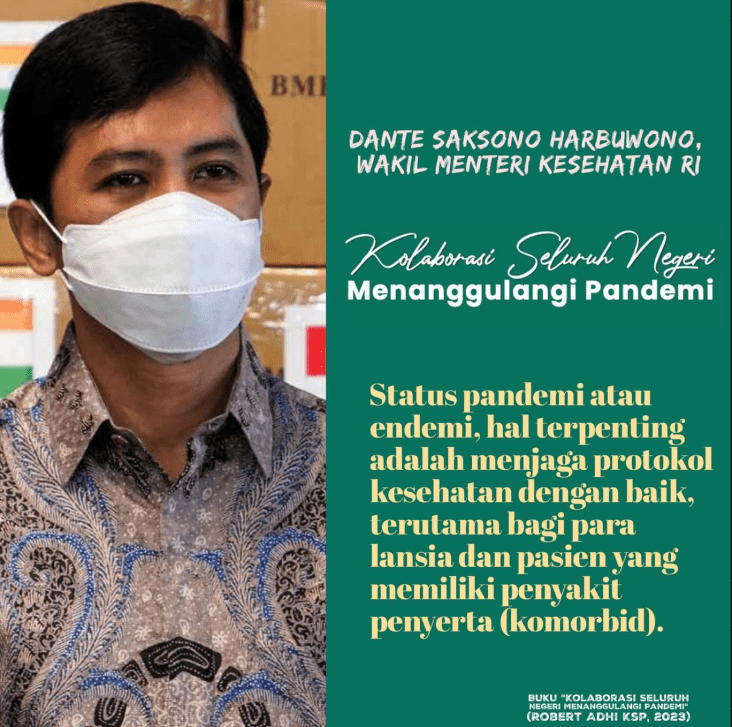 Saya ingin mengutip pepatah latin verba volant, scripta manent, yang bermakna “yang terucap akan hilang, yang tertulis tetap abadi”. Apa yang telah dilakukan jajaran Kementerian Kesehatan menanggulangi pandemi Covid-19 layak tercatat dalam sejarah yang tertuang dalam sebuah buku. Karena jika hanya diceritakan dari mulut ke mulut, keberhasilan Indonesia menangani pandemi akan terlupakan. Without words, without writing, without books, there would be no history. Tanpa kata-kata, tanpa tulisan, tanpa buku, tak ada sejarah, kata penyair dan novelis Inggris Oliver Goldsmith. Semoga buku ini —dengan segala keterbatasannya— bermanfaat bagi khalayak.
