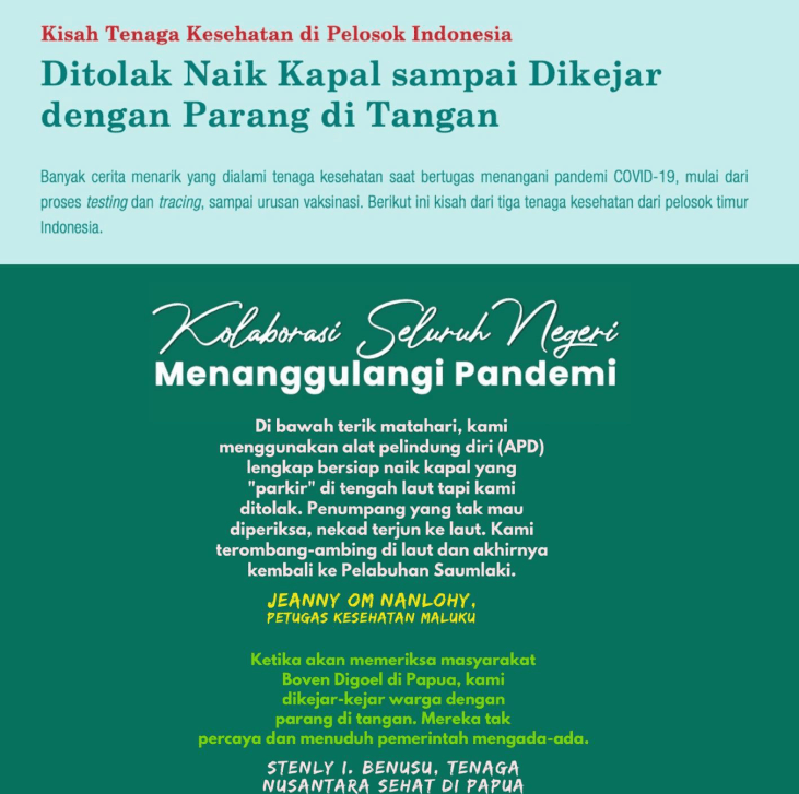 Bagian ini juga memuat kisah tenaga kesehatan, yang bukan hanya yang bertugas di kota-kota besar, tetapi juga yang berada di pelosok pedalaman Indonesia. Ketika banyak orang diminta work from home (WFH) agar terhindar dari COVID-19, tenaga kesehatan juga WFH, work from hospital, mendekati virus.