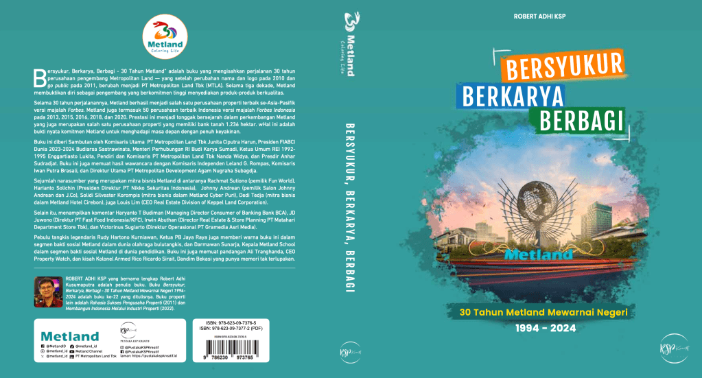 “Bersyukur, Berkarya, Berbagi – 30 Tahun Metland Mewarnai Negeri” adalah buku yang mengisahkan perjalanan 30 tahun perusahaan pengembang Metropolitan Land — yang setelah perubahan nama dan logo pada 2010 dan go public pada 2011, berubah menjadi PT Metropolitan Land Tbk (MTLA). Selama tiga dekade, Metland membuktikan diri sebagai pengembang yang berkomitmen tinggi menyediakan produk-produk berkualitas.