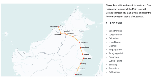 Stasiun-stasiun di tahap kedua akan dibangun di Bukit Panggal (Brunei Darussalam), Long Seridan (Sarawak, Malaysia Timur) , Bekalalan, Malinau, Tanjung Selor (Kalimantan Utara, Indonesia), Tanjungredeb, Pengadan, Lubuk Tutung, Bontang, Samarinda, Balikpapan (Kalimantan Timur, Indonesia).