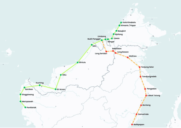 Stasiun-stasiun di tahap pertama akan dibangun di Pontianak, Mempawah, Singkawang, Sambas (Kalimantan Barat, Indonesia), Kuching, Sri Aman, Sibu, Bintulu, Miri (Sarawak, Malaysia Timur), Bukit Panggal (Brunei Darussalam), Limbang (Sarawak, Malaysia Timur), Bangar (Brunei Darussalam), Lawas (Sarawak, Malaysia Timur), Sipitang, Beaufort, Kimanis, Kota Kinabalu (Sabah, Malaysia Timur).