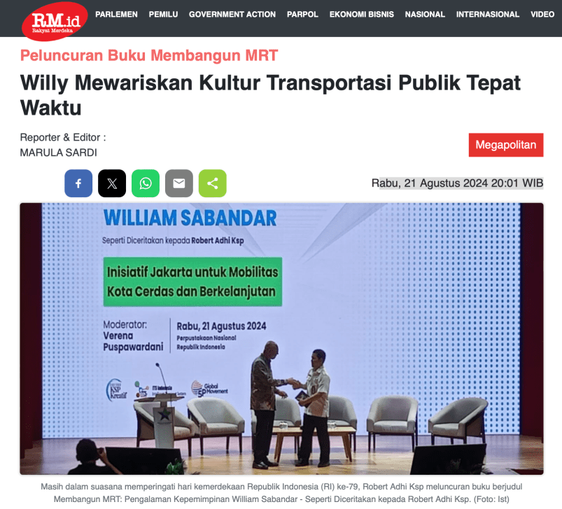 RM.id Rakyat Merdeka – Masih dalam suasana memperingati hari kemerdekaan Republik Indonesia (RI) ke-79, Robert Adhi Ksp meluncuran buku berjudul “Membangun MRT: Pengalaman Kepemimpinan William Sabandar” – Seperti Diceritakan kepada Robert Adhi Ksp.
