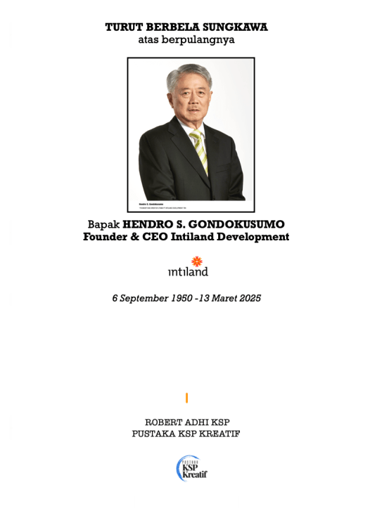 Hendro S Gondokusumo, Founder dan Direktur Utama PT Intiland Development Tbk berpulang pada Kamis 13 Maret 2025 di Singapura pukul 03.29 waktu setempat karena serangan jantung. Hendro S Gondokusumo adalah salah satu tokoh penting dalam industri properti Indonesia. Berikut catatan Robert Adhi Ksp tentang Hendro S Gondokusumo yang diringkas buku-buku “Rahasia Sukses Pengusaha Properti” (2011), “Membangun Indonesia Melalui Industri Properti” (2023), dan “26 Kisah Inspiratif Pemimpin Industri Properti” (2025).